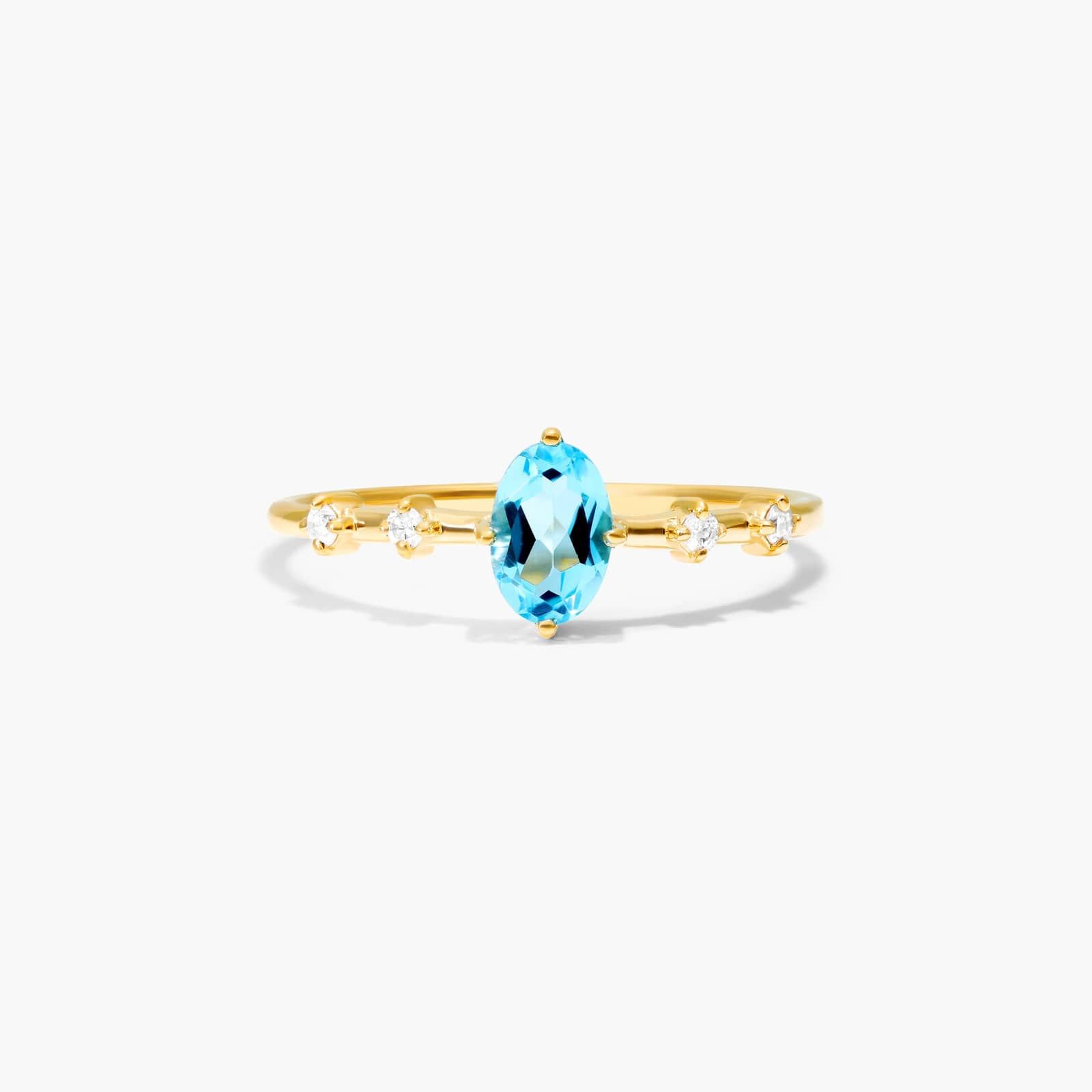Oval Blue Topaz And Diamond Birthstone Ring In 14K Yellow Gold