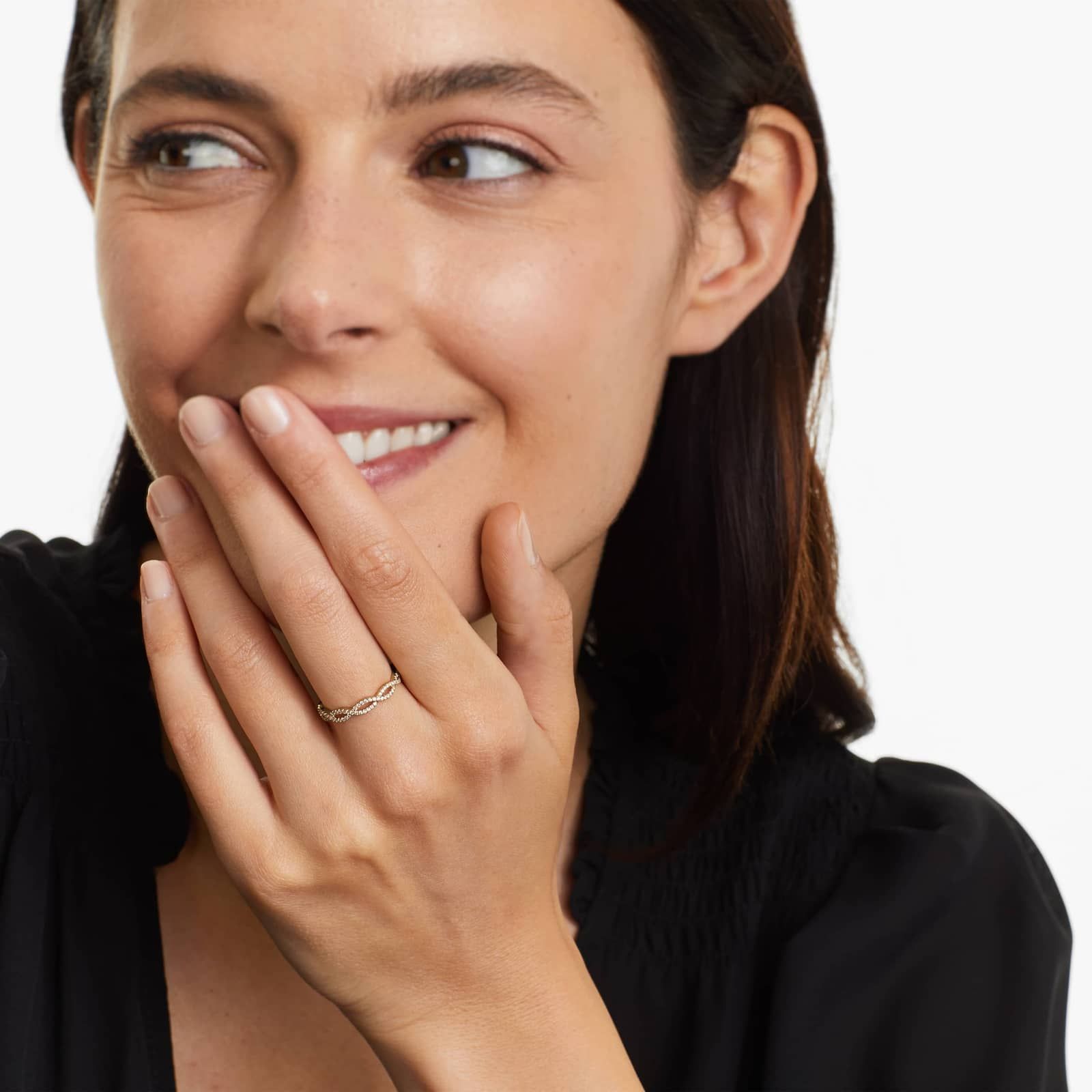 The infinity design is a timeless classic perfect for everyday wear, and the open weave lends added elegance to this petite design. Crafted in 14K gold, this piece is beautiful worn on its own or with other stackables for a trendier look.