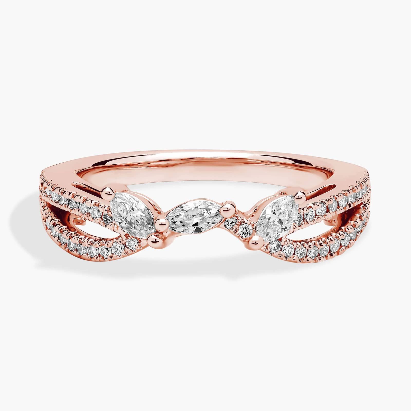 A trio of marquise diamonds are thoughtfully placed along this 14k rose gold wedding band. Designed to wrap around your chosen engagement ring, twists of pavé-set diamonds beautifully compliment your stack.