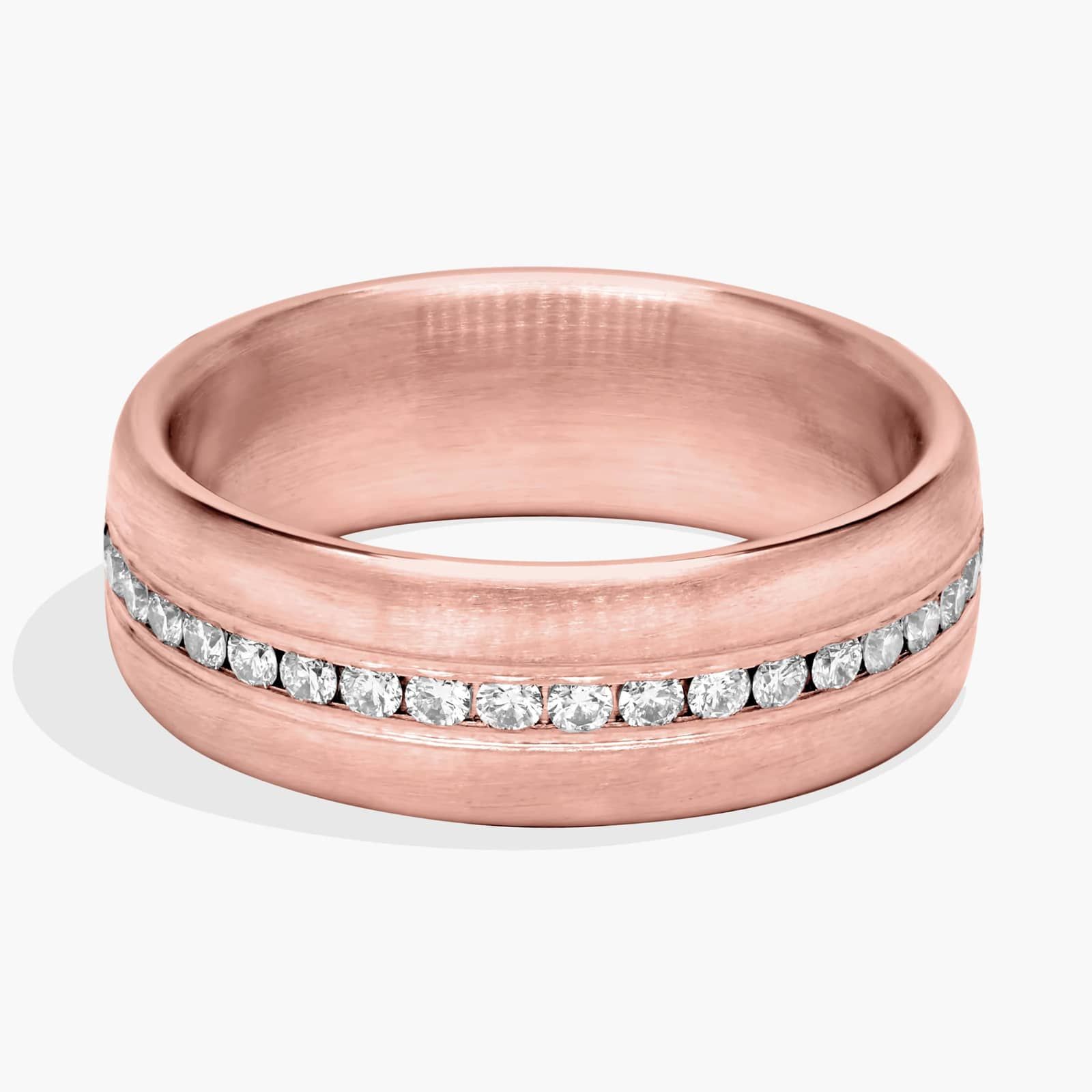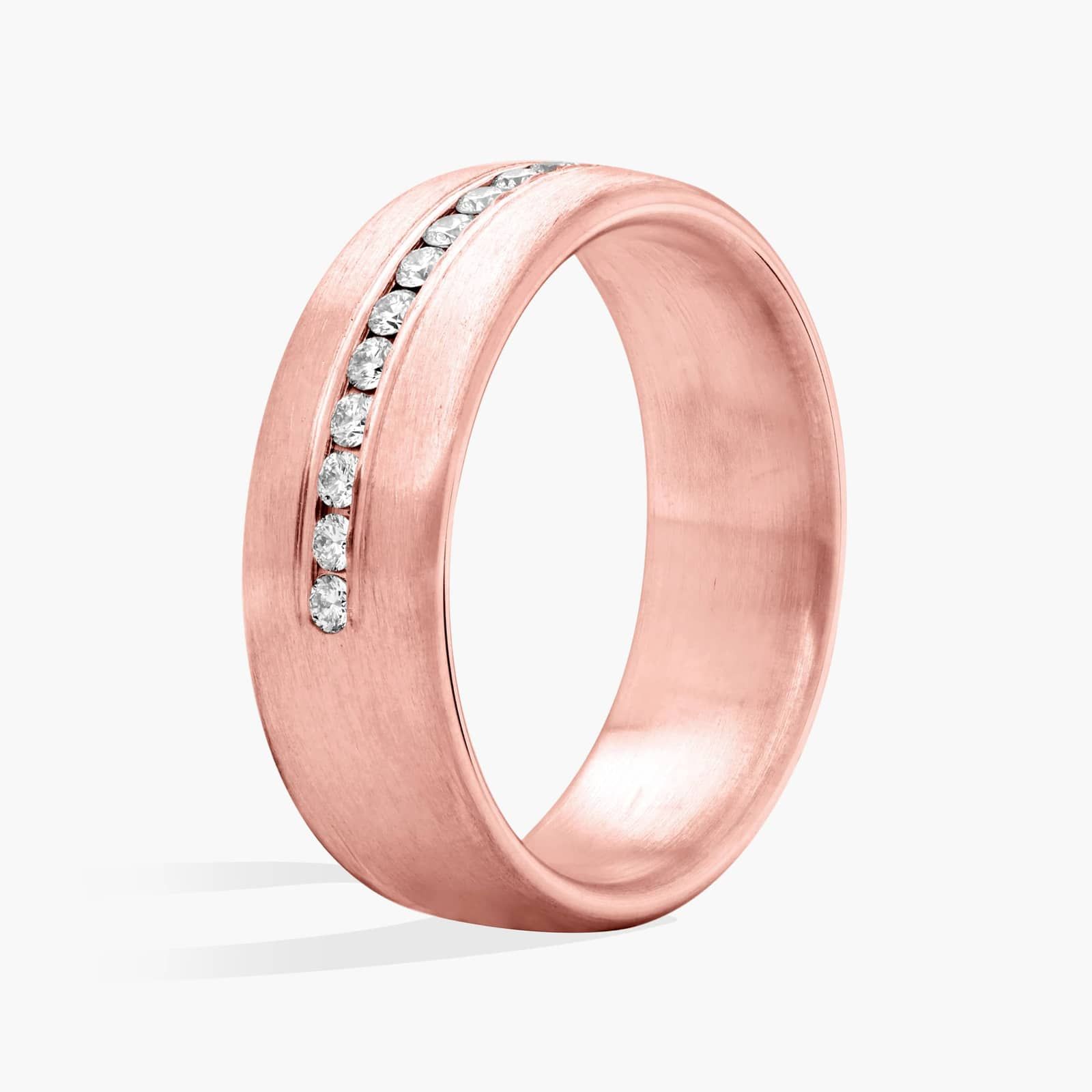 With hand-selected diamonds and a 14k rose gold satin finish, this band is a piece that can be worn daily. It's most popular as a wedding ring, but anyone with an admiration for natural diamonds can wear this ring.