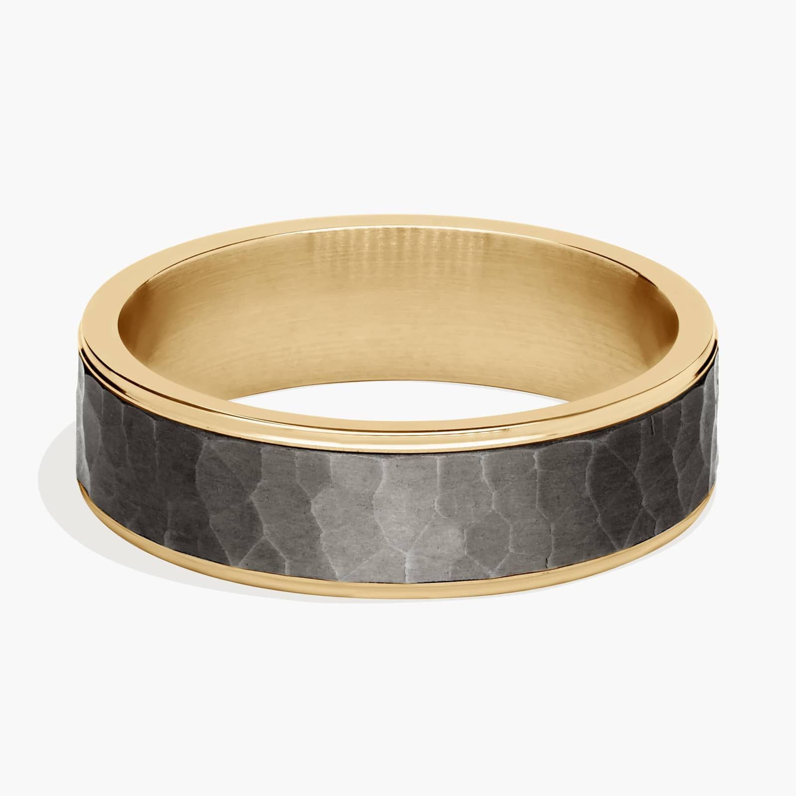 Timeless tantalum, 14k yellow gold and hammered details make this wedding ring a durable and stylish piece for frequent wear. It's easy to style and even easier to maintain.