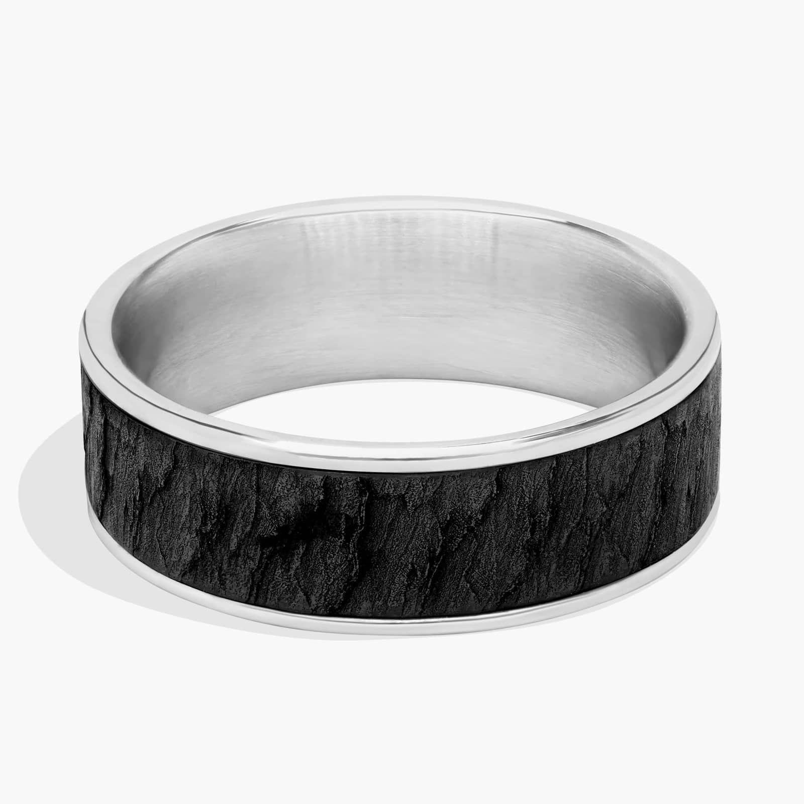 This ring's lava rock pattern is rugged and durable with tantalum details. It's crafted by our artisans in 14k white gold, making this wedding band the perfect ring for daily wear.