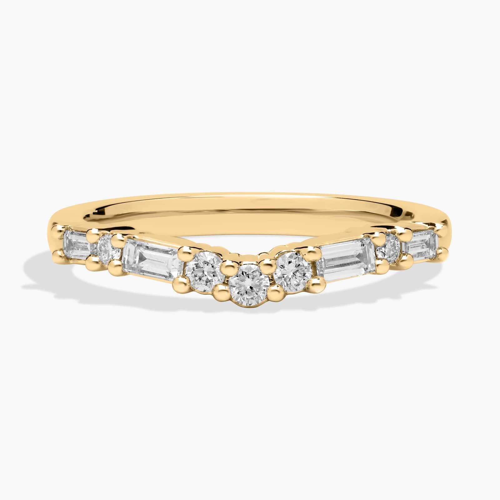 Baguette and round diamonds are set together on a curved chevron band for unique styling. Wear this band on its own or add it to your favorite ring stack. With handcrafted 18k yellow gold, it's an enduring piece for any occasion.